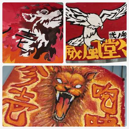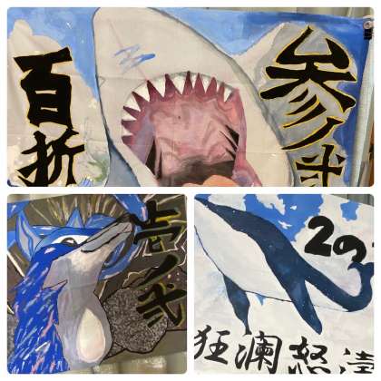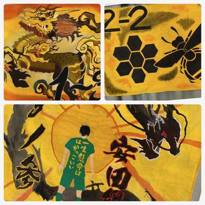 すべてのクラスの学級旗が多目的室にそろいました。どのクラスの旗も体育大会を盛り上げたいと伝わる力作ばかりです。