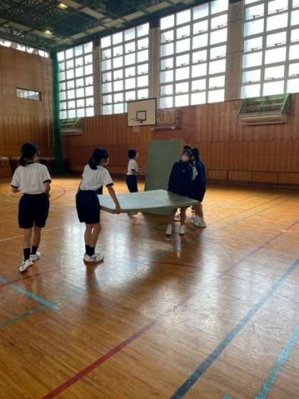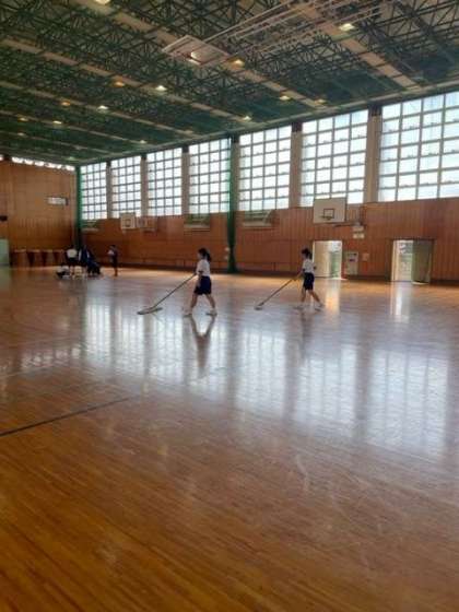 体育館では柔道の授業準備として、体育館のモップ掛けと畳のふき掃除、柔道場設営を1年1組2組のみなさんが行ってくれていました。丁寧に取り組む姿を見て、このような見えない仕事を黙々とできるみなさんが誇らしかったです。
