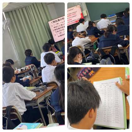 3限目、英語の授業では、現在進行形の学習をしていました。動詞の後にingをつけるパターンを学習する際に、リズムに乗って読むように指導されていました。