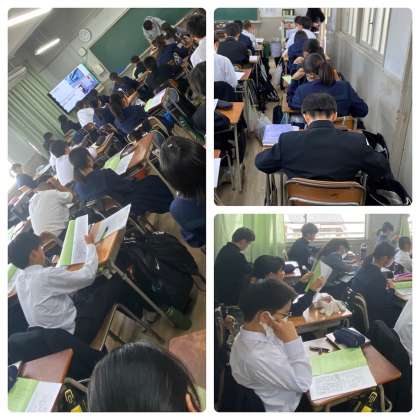 明日、1年生は、舳松人権歴史館を見学したり、その周辺をフィールドワークしたりします。事前指導では、教育、仕事などの6つの視点を持って学習するように指示がありました。