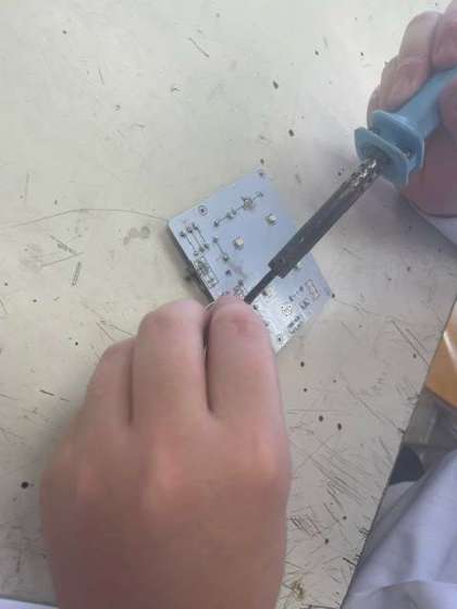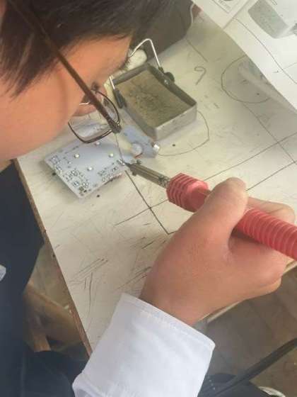 みなさん真剣に「はんだごて」を使用してライトづくりに励んでいました。
