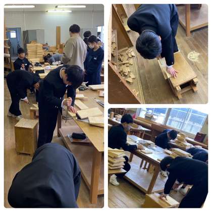 5限目、1年生は木工室で黙々とのこぎりで板を切っていました。のこぎりの歯が悪いのか、切り方が良くないのか。。。皆さん、とても苦労している様子で、教科担当の先生が丁寧に指導していました。
