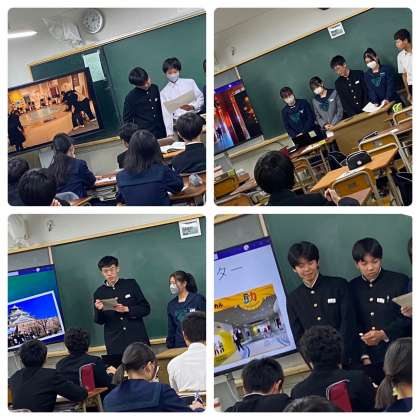 6限目、2年生は教室でクラス別に校外学習の発表会を行いました。行き先に限りがあるので、発表するポイントが似ているところもありましたが、それぞれに工夫があって良かったです。