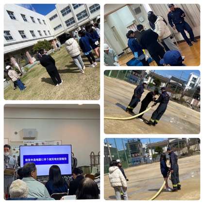 全校集会で周知した東粉浜地域での防災の取組が東粉浜小学校で開催されました。消防士さんから防災ポンプの使い方や被災時の応急処置について説明がありました。また、区役所の方が石川県の小学校へ支援に行かれた話もありました。