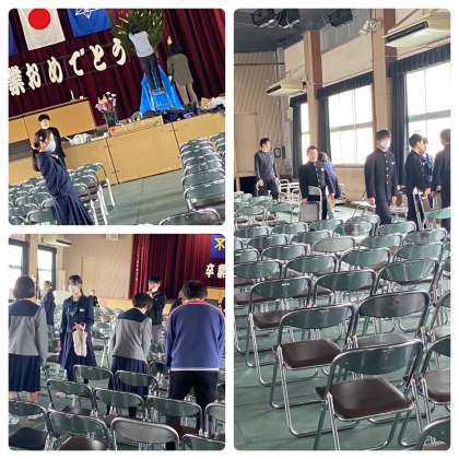 今日は、午前中から卒業式の予行がありました。午後からは、在校生が心を込めて準備し、式場はビシッとした式典となる雰囲気が出来上がりました。