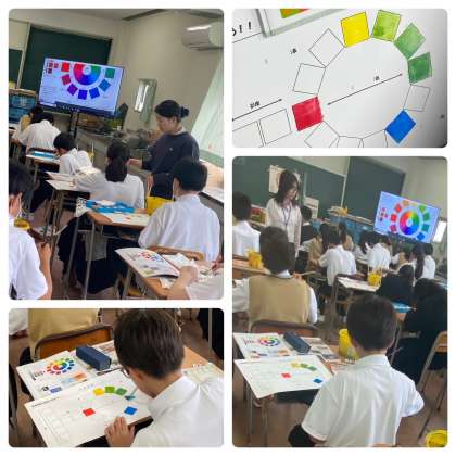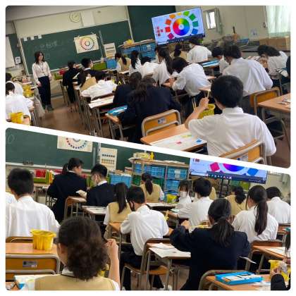 5限目、1年生は色相環の学習をしていました。作品は、色の変化をパレットで確認してから丁寧に塗る人もいれば、塗りながら紙の上で色を変化させようとする達人もいました。