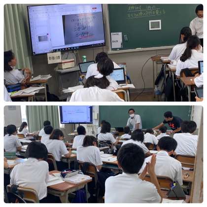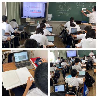 1限目と2限目、一次式を計算する授業をしていました。学習者用端末で自分の解答を撮影して共有し、途中式の説明もしていました。
