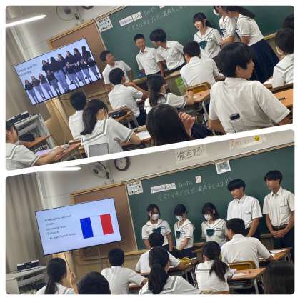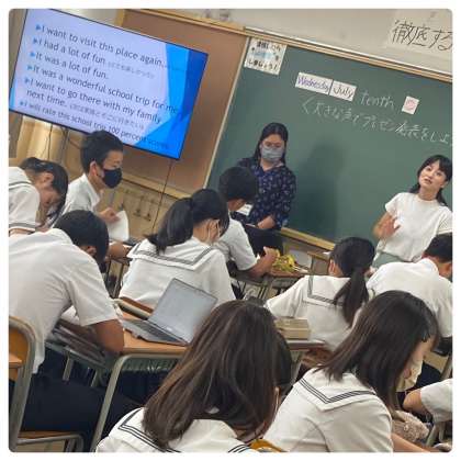 3限目、各班で作成した修学旅行のPowerPointを電子黒板から披露しながら、宮島で外国人観光客にインタビューした話を英語で発表しました。