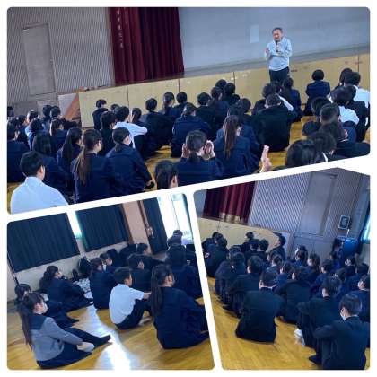 集会では、時間を守ることや学習者用端末を適正に使うこと、すべて自分自身の今後に影響するという話でした。