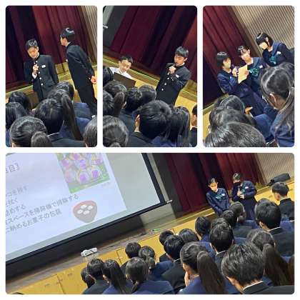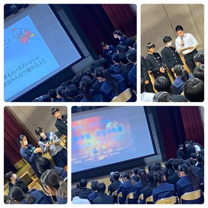 6限目、職場体験で学んだことの報告会が講堂で行われていました。決められたルールでPowerPointを工夫するところもあれば、報告にクイズを取り入れているグループもありました。