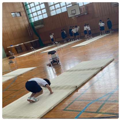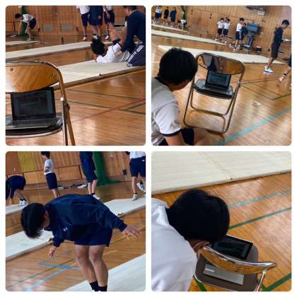 4限目、体育館では、マット運動の学習をしていました。テストに向けて学習者用端末の追いかけ再生機能を活用しながらの学習でした。