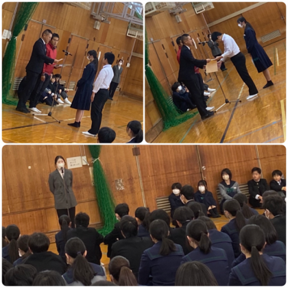 今週は、表彰、臨時に来ていただいた栄養職員の先生の紹介、そして安田先生からのお話と盛りだくさんでした。