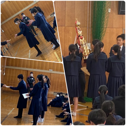 吹奏楽部、女子バスケットボール部の表彰に加え、空手で優勝した生徒の表彰で始まりました。こんなに大きなトロフィー、初めて持ちました。