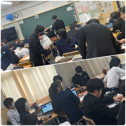 6限目、3年生は、一週間後に行われる私立入試に向けて、出発時間、最寄駅、持ち物等を確認し、先生たちに提出していました。
