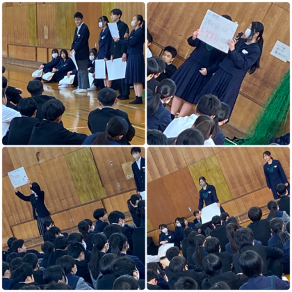 卒業式が控えているので、金曜日ですが集会を行いました。報告している中、最後まで前に立ってくれている3年生、今後の住吉中学校を背負ってくれる1年生と2年生、それぞれへの思いが込み上げてきました。