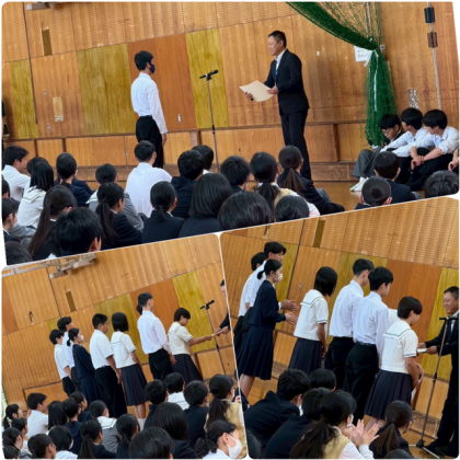 今日は、陸上競技部の表彰と学級役員などの認証状の伝達がありました。リーダーもフォロワーもみんなの学校生活がより良くなるよう、お互いに感謝の気持ちを大事にして様々な事に取り組みましょう。