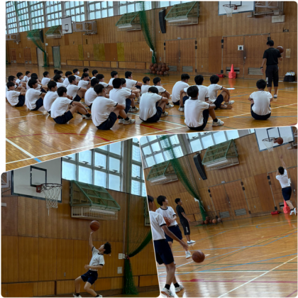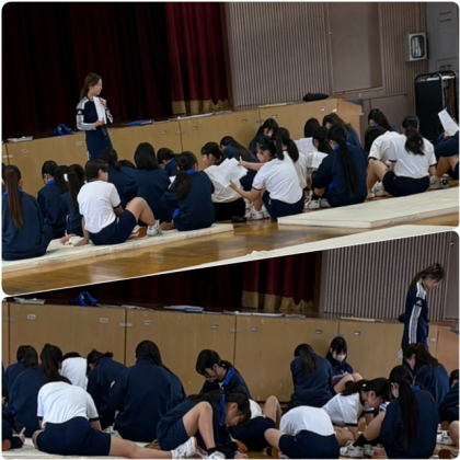 3限目、体育館ではバスケットボールのレイアップシュート、講堂では、前転や後転の学習をしていました。