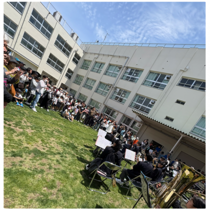 さわやかな風が吹く晴天の中、東粉浜小学校で地域の春まつりが行われました。オープニングでは、吹奏楽部が演奏や歌、ダンスなどのパフォーマンスで大勢の人を笑顔にしてくれました。