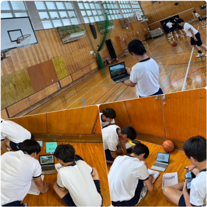 2限目と3限目、3年生が体育館でバスケットボールの学習をしていました。学習者用端末を活用してレイアップシュートのフォームを確認していました。