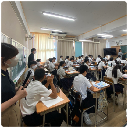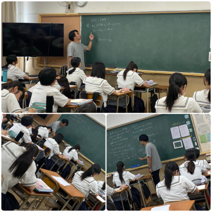 今日は、3年生の数学の授業にたくさんの先生たちが見学に来られました。二次方程式を利用して文章問題を解く学習でした。
