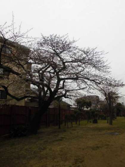 (あいにくに雨天、寒さで桜もまだです。)