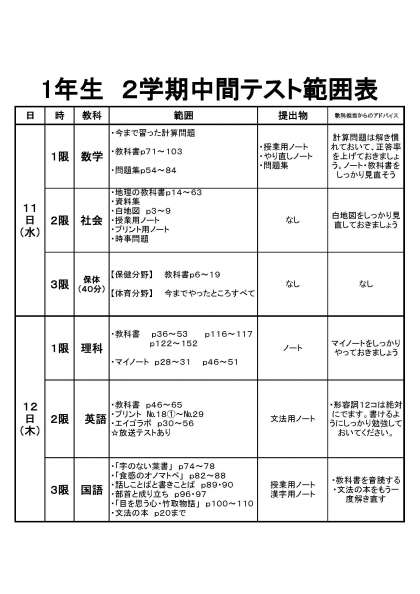 1年生 2学期中間テスト試験範囲・日程表
