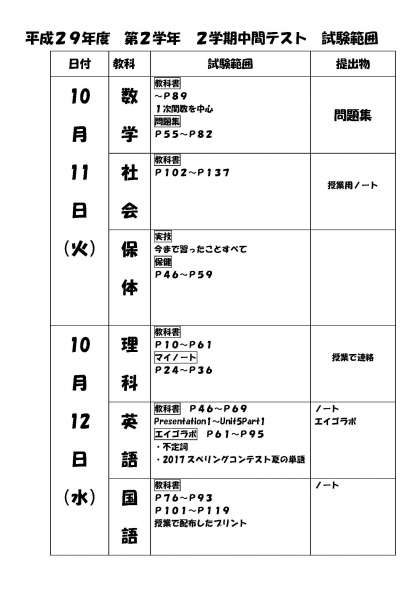 2年生 2学期中間テスト試験範囲・日程表