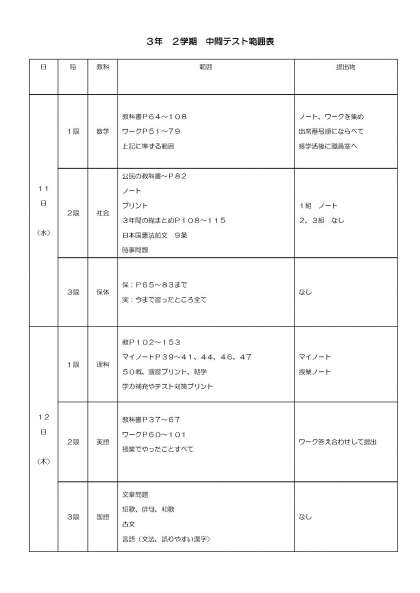 3年生 2学期中間テスト試験範囲・日程表