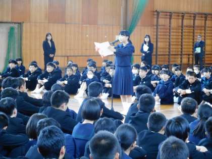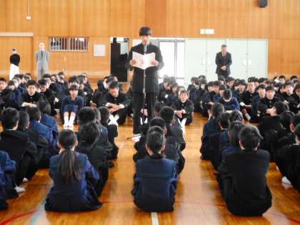 4月9日(月)、登校した2.3年生のクラス発表があり、「やったー!」と歓喜の声が聞こえてきます。その後、新入生117名を含め計338名の子どもたちが体育館集合し、1学期の始業式を行いました。担任発表や校長先生の話の後の対面式では、在校生の代表が「一日も早く中学校生活に慣れてほしい」と新入生に暖かい言葉をかけると、新入生の代表からは「希望や不安もありますが、先輩方と一緒に頑張っていきたい」と決意の言葉が述べられました。さぁ、1年間のスタート。気持ちも新たに進んで行きましょう。