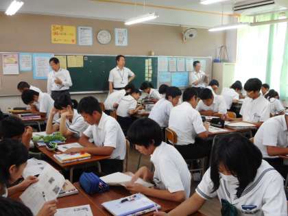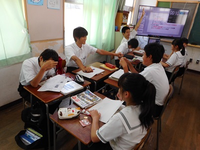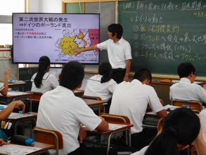 6月4日(月)5限、 3年3組社会科の授業。今時の目標は「資料の読み取りを通じて、日米関係が悪化した過程を説明しょう」。大型テレビを利用し当時の時代背景を学んだあと、配付された資料を基に、班単位で自分の意見・仲間の意見を交流し、班の考えをまとめて発表します。教育委員会の方々にも参観いただき、「主体的・対話的で深い学び」についての実践研究を進めています