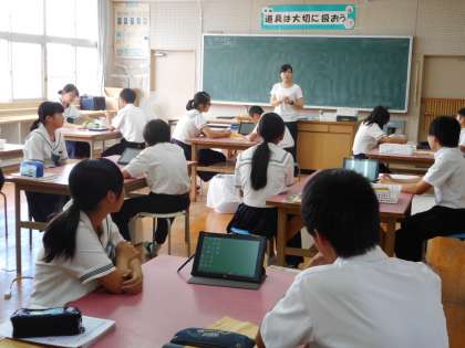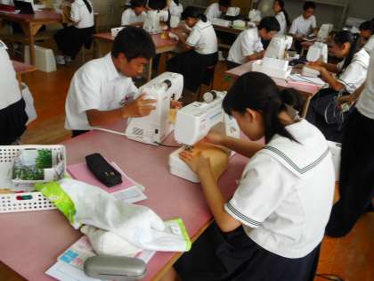 7月2日(月)2限、2年3組家庭科の授業。学級を半分に分割し、家庭科と技術科の授業を行っています。上糸のかけ方・下糸の出し方をタブレットの映像で確認し作業開始。ミシンでコの字を縫っていきます。手順が難しい生徒はタブレットの映像で再確認しながら作業を進めていました。ミシンの取り扱いには個人差があるので、ICT機器が有効に活用された授業展開となっていました。