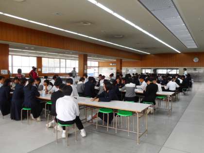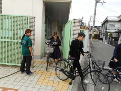 自校給食に向け、昼食ホールの改修工事が本格的にスタート。写真左の囲いは資材・廃材置き場です。2年生は6限目、11月8.9日の両日行う「職場体験学習」の挨拶訪問に出発。少し距離のある事業所は、自転車を利用しました。