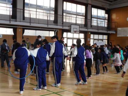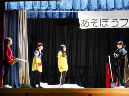 1月19日(土)、小中学校PTA主催の「あそぼうフェスタ」が開催されました。最初に吹奏楽部が「みんながみんな英雄」をはじめ3曲を演奏。次に、放送・演劇部が「白雪姫」を上演しました。小学生をはじめ会場からは大きな拍手をいただきました。その後、小学生と中学生が一緒になって室内ゲームを楽しみました。PTA・教職員・児童生徒が一体となって交流を深めることができました。