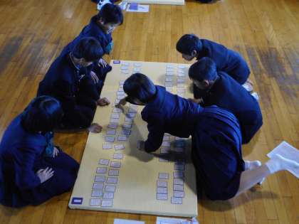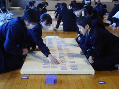 2月1日(金)5.6限、2年生の「百人一首」大会が開かれました。太鼓の打つ音に合わせて先生が読み始めます。すぐに「ハイ」と札に手を伸ばす生徒も。1年生時にも経験しているので内容はレベルアップしています。聞くと、百首すべて覚えている生徒もいるそうです。皆で楽しく伝統文化に親しみました。優勝クラスは2組でした。