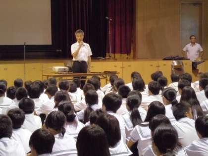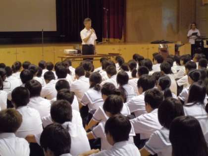 講堂に集まり、集会形式で行われました。
