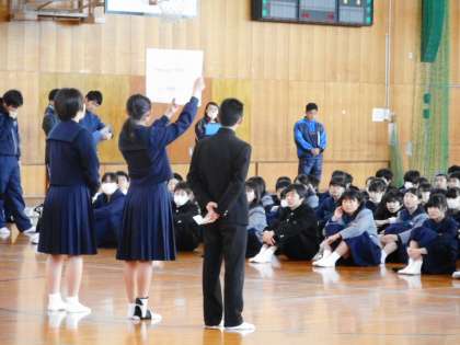 2月15日(金)、3年1組の登校が再開し、体育館では「生徒会集会」が開かれました。各生徒専門委員会から決定事項を報告します。画用紙に書いてアピール度を高めたり、寸劇をして印象付けるような工夫があります。生徒会からは、広く意見や要望を集めるために「生徒意見箱」の設置の連絡がありました。生徒が主体的に考え運営している集会でした。