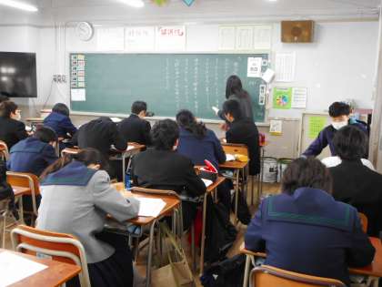 2月20日(水)2限、1年1組国語科の授業。1学級を2分割し教室と大会議室での授業。学ぶ内容は「文法」。形容詞と形容動詞です。文章から形容動詞を抜き出し、活用形と終止形を答えていました。人数が半分になるため、一人が答える回数も増え自然と集中度も増します。文法のテキストを忘れている生徒が数人いたのが残念。学年末テストに向けて家庭学習もしっかりと!