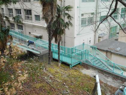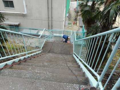 2月27日(水)、河川の氾濫など、水害から一時的または緊急に避難する「避難階段の改修工事」が始まりました。この階段は、小学校から本校の西側にあがる階段。基礎はコンクリートで補強し、階段部分の腐食した鉄板は張り替えます。1週間程度の工期です。
