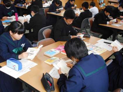 3月7日(木)2限、2年3組国語科の授業。図書館で「おためし読書」の取り組み。机の上には、図書館補助員の方が選んだ「中学生にお勧めの本・読みやすい本など」が20冊置いてあります。気になった本を1冊選んで5分間読書。その後、1分間で評価します。これを6回繰り返します。続きを読みたい本が見つかればいいですネ。