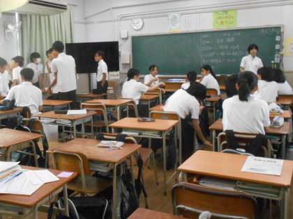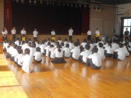 2年生の学年集会では、代議員が考えた今月の学年目標の発表と体育大会での学年種目の説明がありました。先生たちが提案してくれた学年種目は、みんなが笑顔になれそうな雰囲気がありましたね。