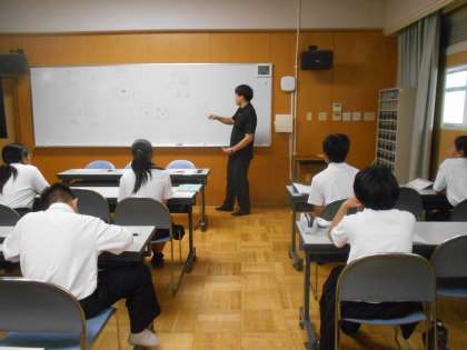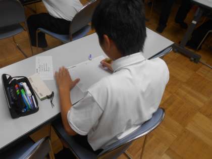 3限目、1年生が多目的室で三面図の学習をしていました。中国から来た生徒も班の仲間からのサポートを受け、三つの方向から見た図を描いていました。