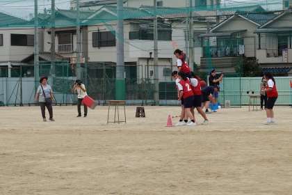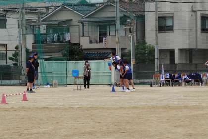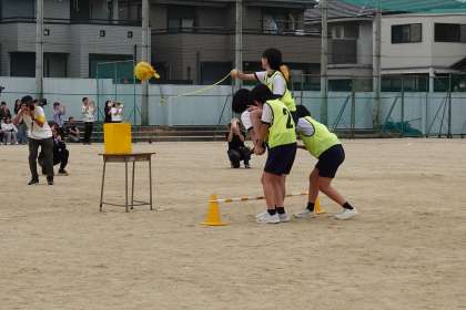 騎馬戦を作り、標的まで曲がりくねった道を進み、ロープの先端に付いたボールを使ってアルミ缶を落とす競技。抜きつ抜かれつで、競った展開となり、盛り上がりました。