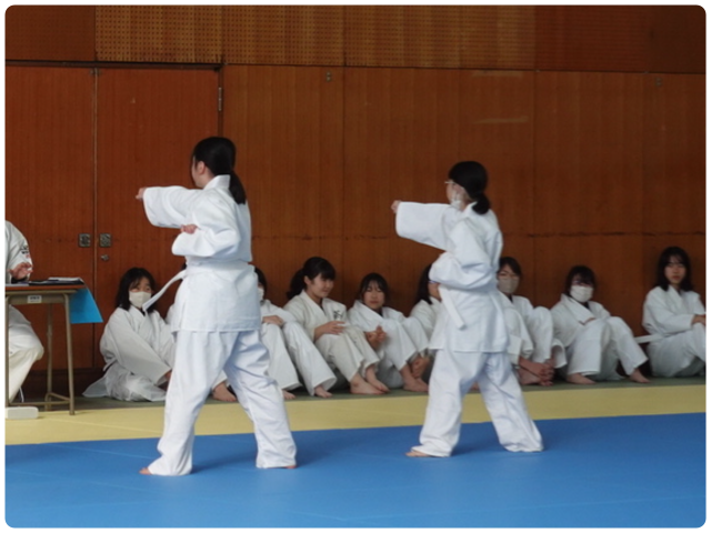 1年生女子の保健体育では、武道の学習として空手に取り組んでいます。今日は、これまで学習した内容をテストしているようでした。
