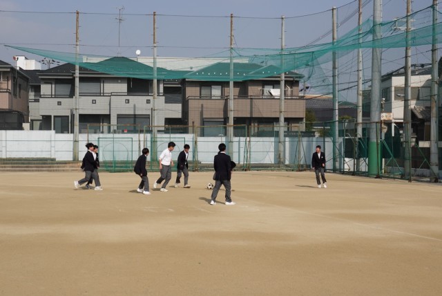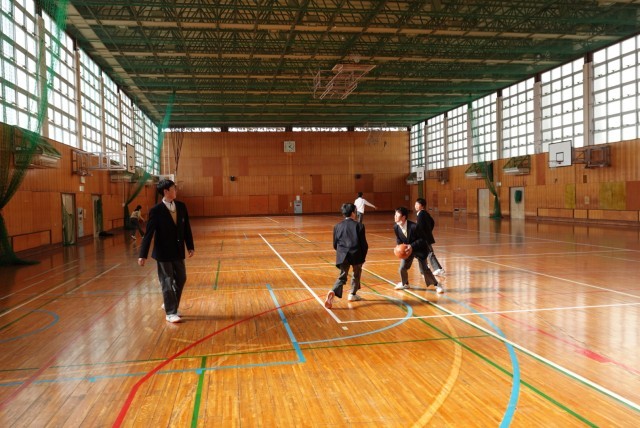 冬の冷たい風が吹く中、昼休みにグラウンドや体育館でサッカーやバレーボールをしている1、2年生の生徒がたくさんいました。