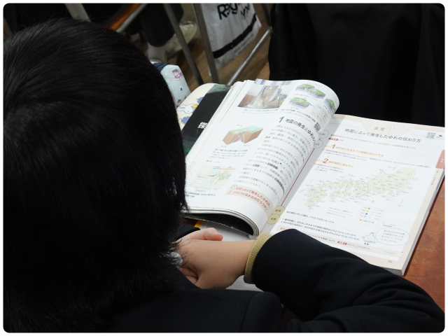 4限目、1年生は、地震の揺れについて学習していました。小さな揺れである初期微動、その後に大きく揺れる主要動など、説明をよく理解し、スラスラと解答する姿が見られました。授業では、私たち大人が経験した阪神・淡路大震災の映像も取り上げられました。皆さんの中には、まるで映画のワンシーンのように感じた人もいたかもしれません。しかし、先生からの話にもあったように、地震はいつ起こるかわからないのが現実です。地震の性質を学ぶこととあわせて、自分や大切な人の命を守るために何ができるのか、防災についても考える時間も大切にしてください。