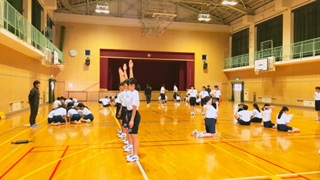 体育の授業です。タブレットで各班の集団行動のテストの流れを撮影しました。それを見て自分たちのできてないところを確認し改善する取り組みを行いました。
