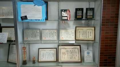 大和川中学校の玄関にはたくさんの賞状があります。ぜひ立ち止まってみて見てください。