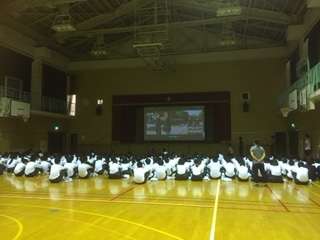 今日は修学旅行で鹿児島県に行っている3年生とスカイプでつないで、2年生と合同で平和学習を行いました。