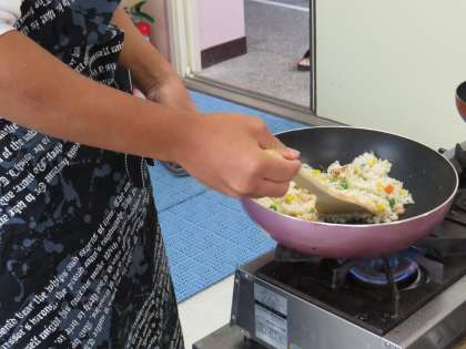 10月7日 1階 調理室から いいにおいがする。2年生の料理実習が始まっていました。今回は、いわしを開き、パン粉をつけ揚げる。チャーハンを炊きながらつくる。1時間で今回もできましたね。