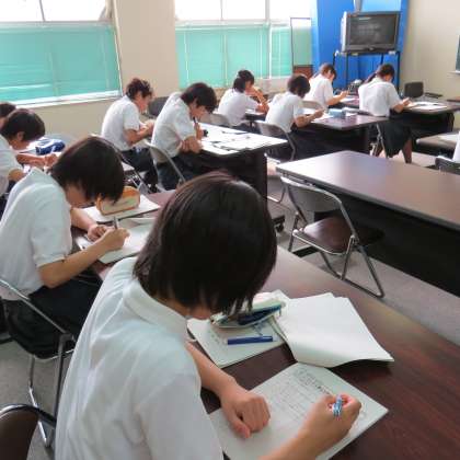 8月6日(火)学力アップサマー講座(3年) 二日目をむかえました。2時間の集中力は必ず次にステップにつながる。すばらしい集中力!テキストをやりながら、わからない所を自分で調べています。どうしてもつまずいた所は、ボランテアの先生に聞きましょう。これからが正念場。わからなくなって、あきらめないこと。やりきりましょう。